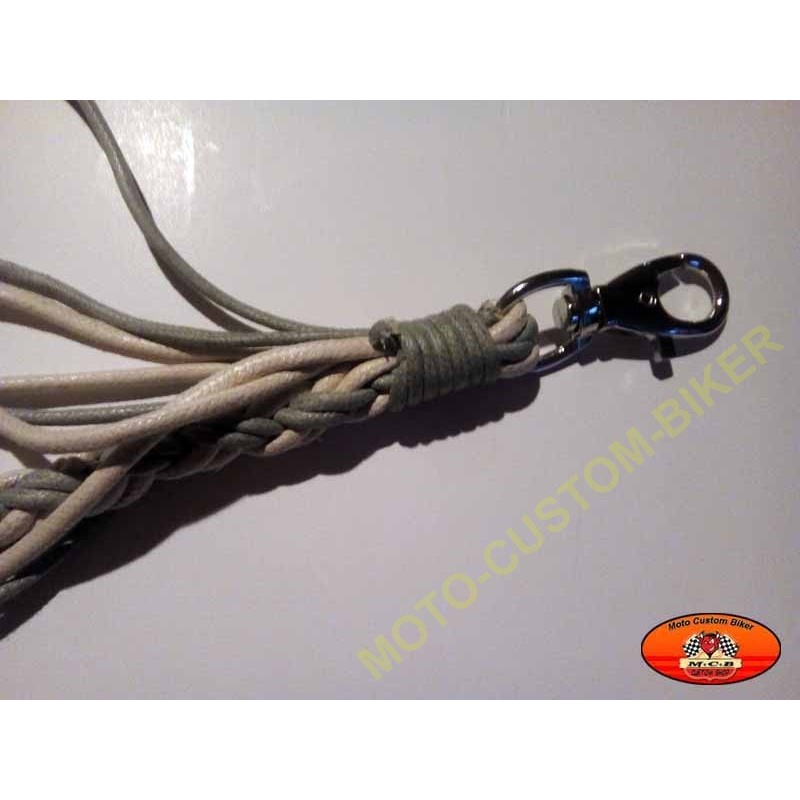 Superbe lanière torsadée de couleur gris et blanc avec finition petites têtes de mort.