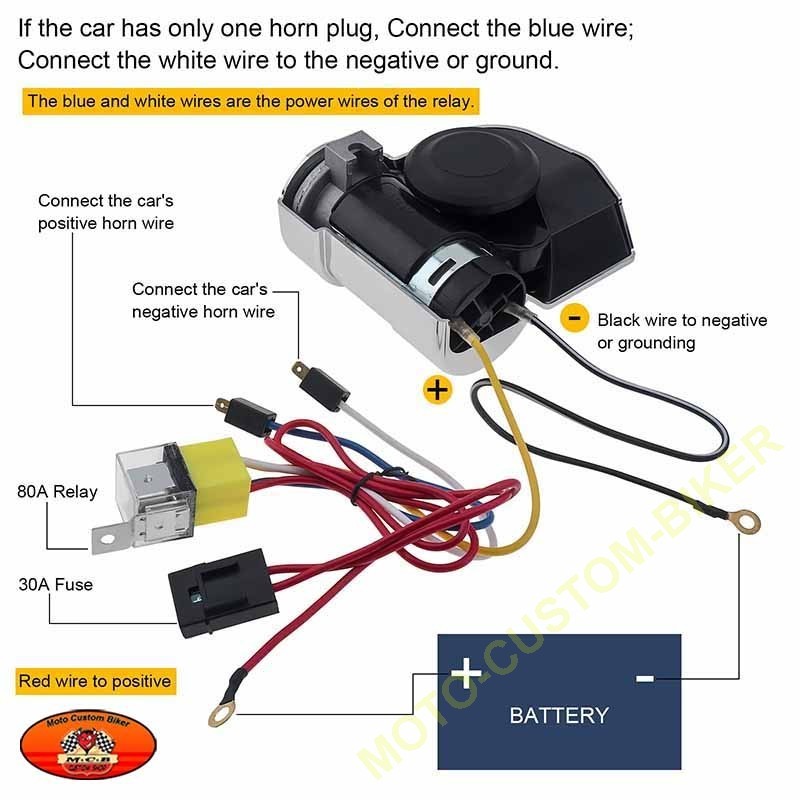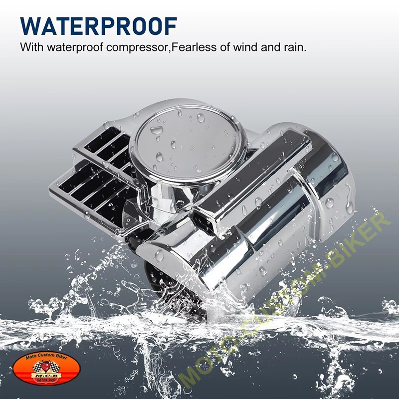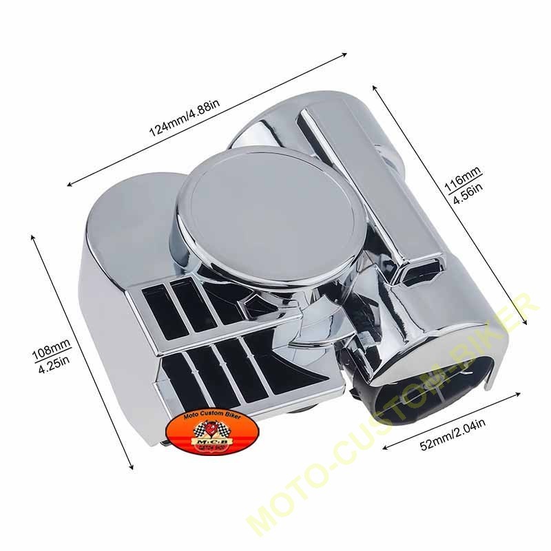 Klaxon à air coque abs entièrement chromé, produit de la toute dernière technologie, en une seule pièce avec son compresseur intégré (pas de raccord de tuyau), installation très facile en remplacement du klaxon d'origine (deux fils à brancher), montage simple en transférant les câbles de votre klaxon d'origine, se monte avec une fixation comprise dans le kit, produit un double son très puissant - 12 volts, 139 dB, très compact pour pouvoir se monter sur moto, voiture ou camion : Compresseur 4.8 cm Longueur 11.7 cm Hauteur 9.2 cm