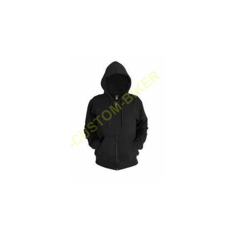 Sweatshirt à capuche zippé noir manches longues de haute qualité 270gr/m², 50% coton, 50% polyester.